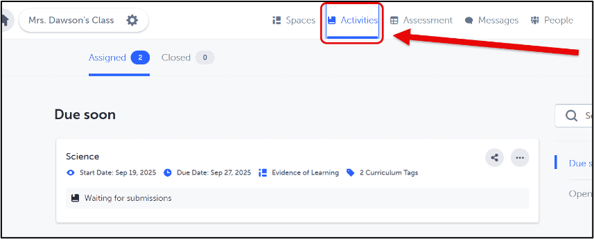 👁🗨 Viewing Activities – Activities are viewed from the “Activities” tab. Clicking here will view all of the activities created in all the 1:1 spaces.